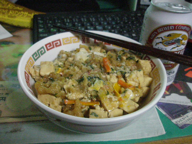 (めんつゆ、黒酢を敷き角切りにした木綿豆腐、かき揚を